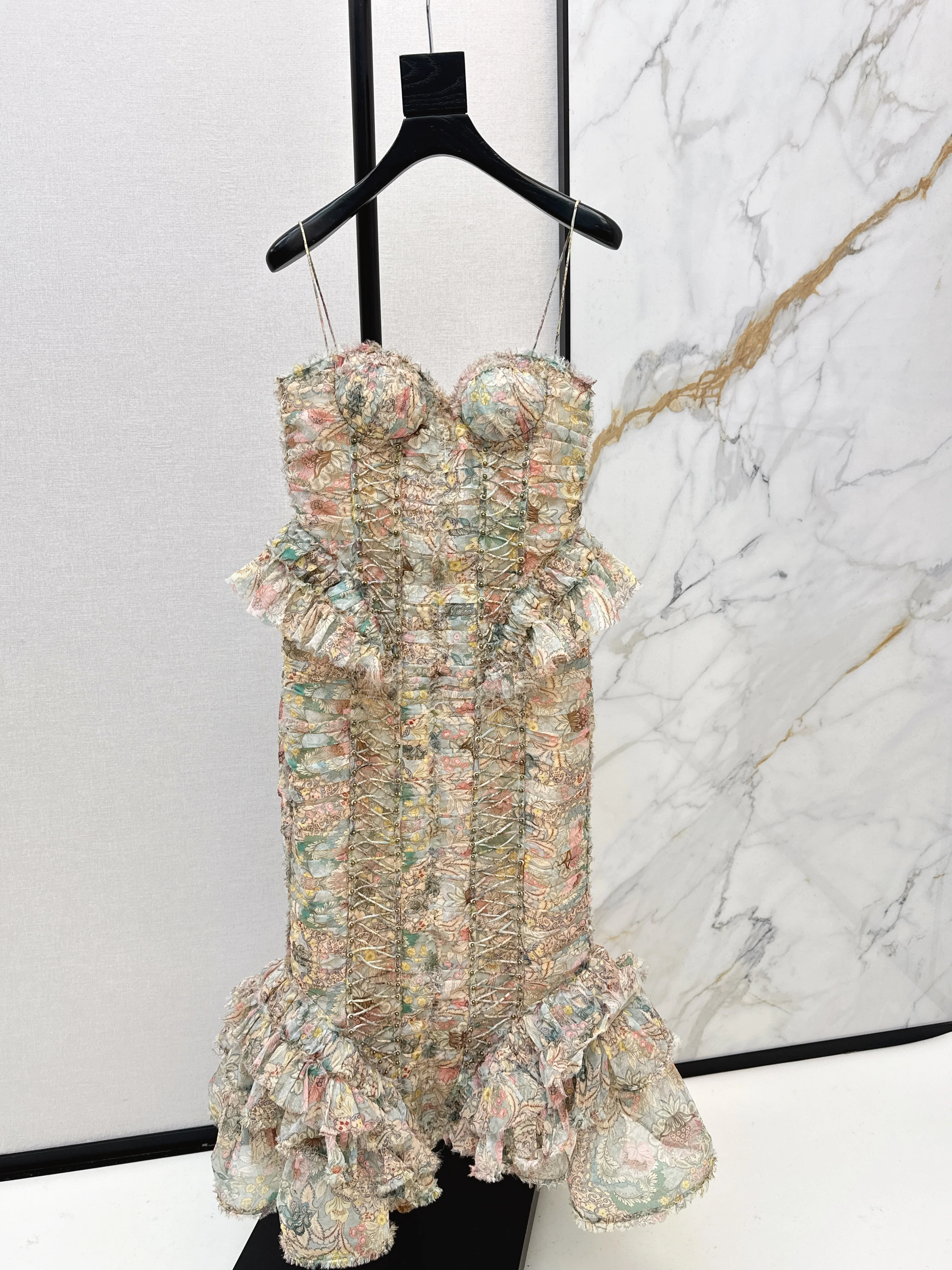 Zimm 26ss silk strapless floral print dress