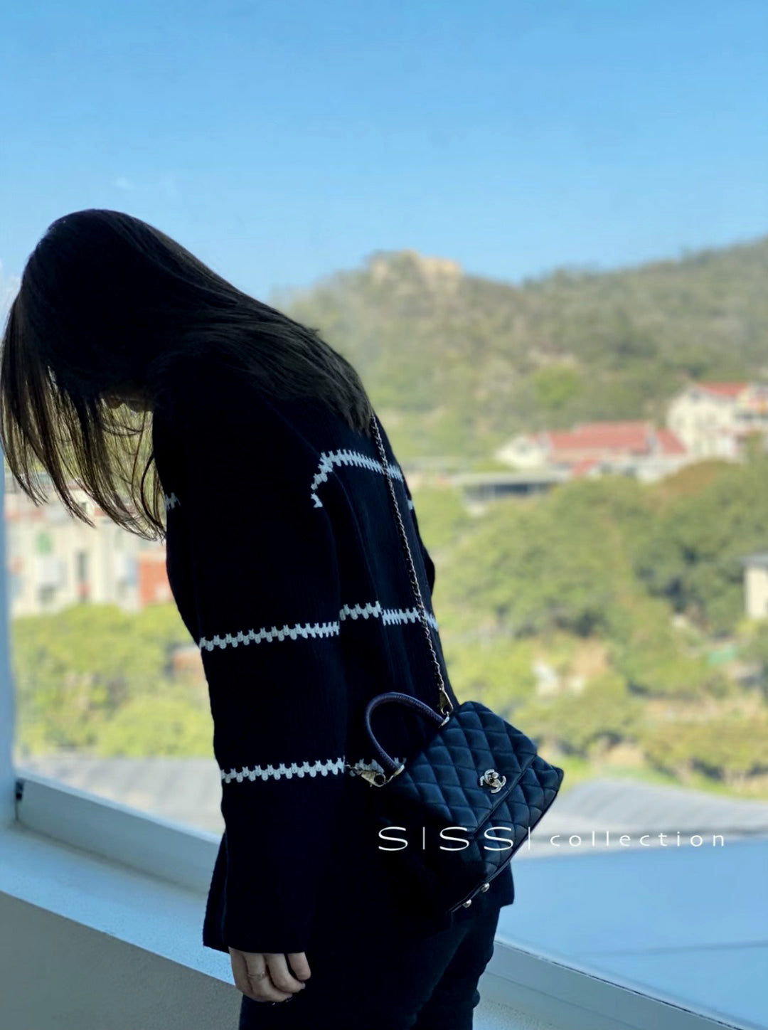 CH MINI FLAP BAG WITH TOP HANDLE 19 Grained Calfskin Lizard Handle Black