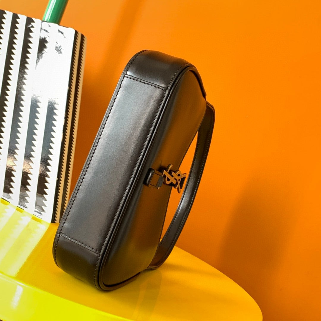 LE 5 À 7 MINI WITH A LEATHER TAB FASTENING, CASSANDRE EMBELLISHMENT AND MATCHING SUEDE LINING.